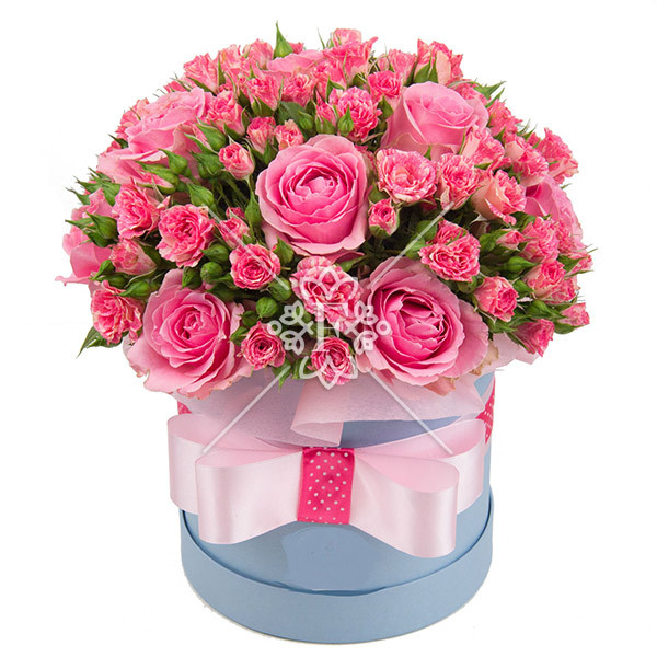 роза розовая – 13 шт., роза кустовая розовая – 12 шт., оазис, коробка, лента.